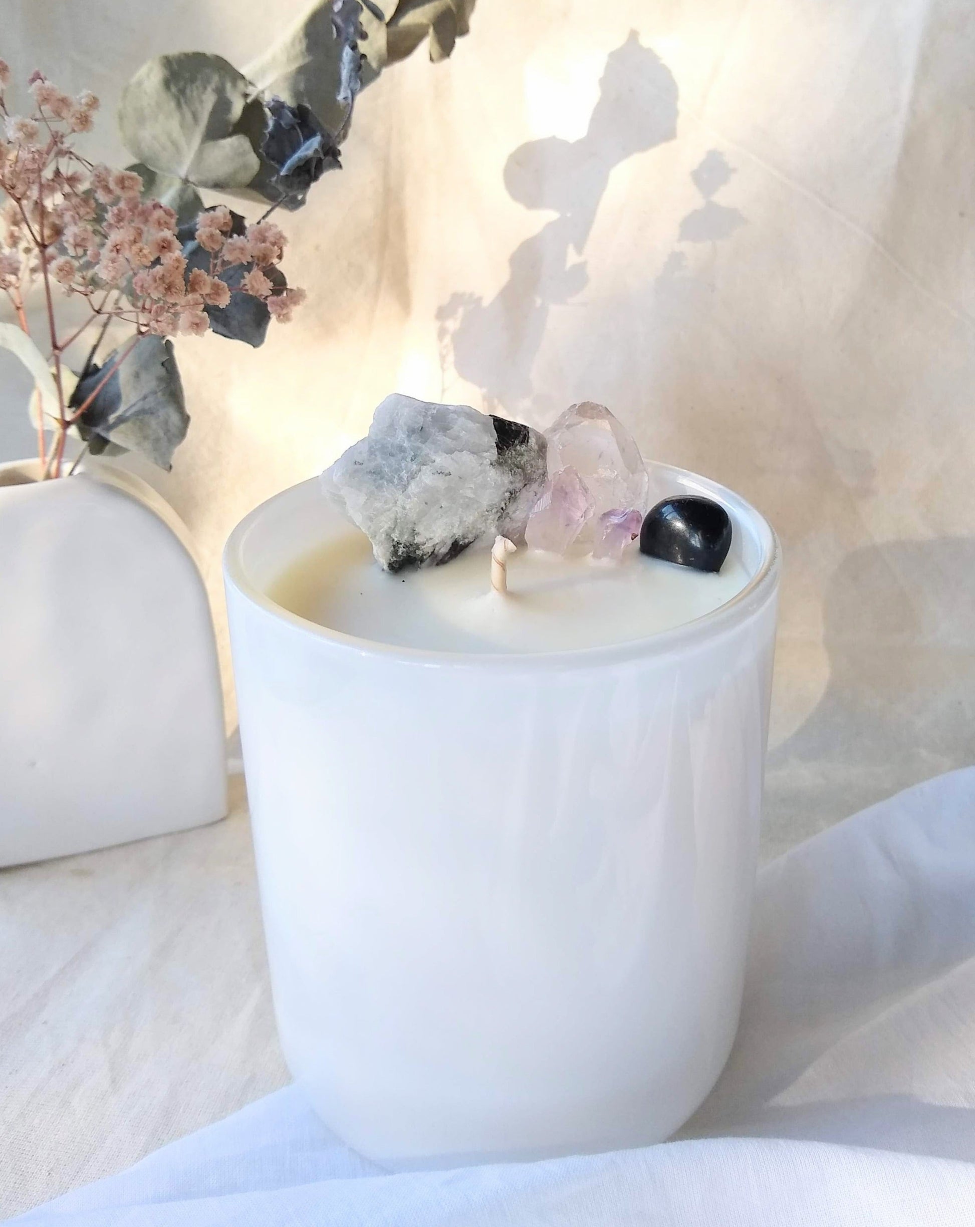 A full moon represents completion and letting go - something which is integral to growing as people. The ideal time for introspection and identifying which parts of ourselves and our lives are complete, our crystals aid in harnessing this positive energy of a completed lunar cycle. Each candle includes Rainbow Moon Stone for growth and strength, Clear Quartz for inspiring guidance, Black Obsidian to absorb our fears, Amethyst for abundance,
