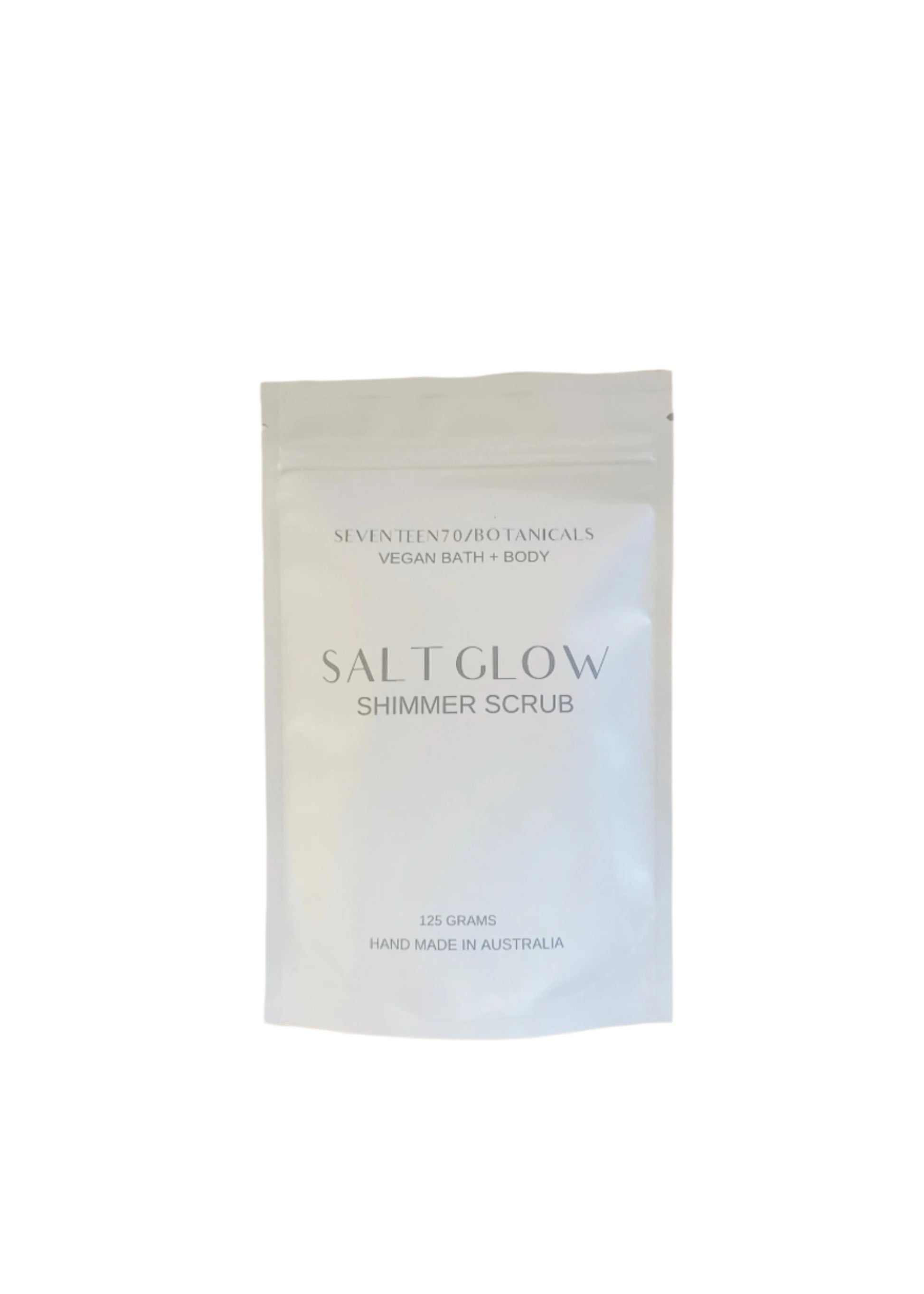 Salt Glow Scrub, a pouch filled with natural ingredients designed to exfoliate, improve skin texture, provide hydration, and promote softness. Rinse off to reveal a radiant shimmering glow.